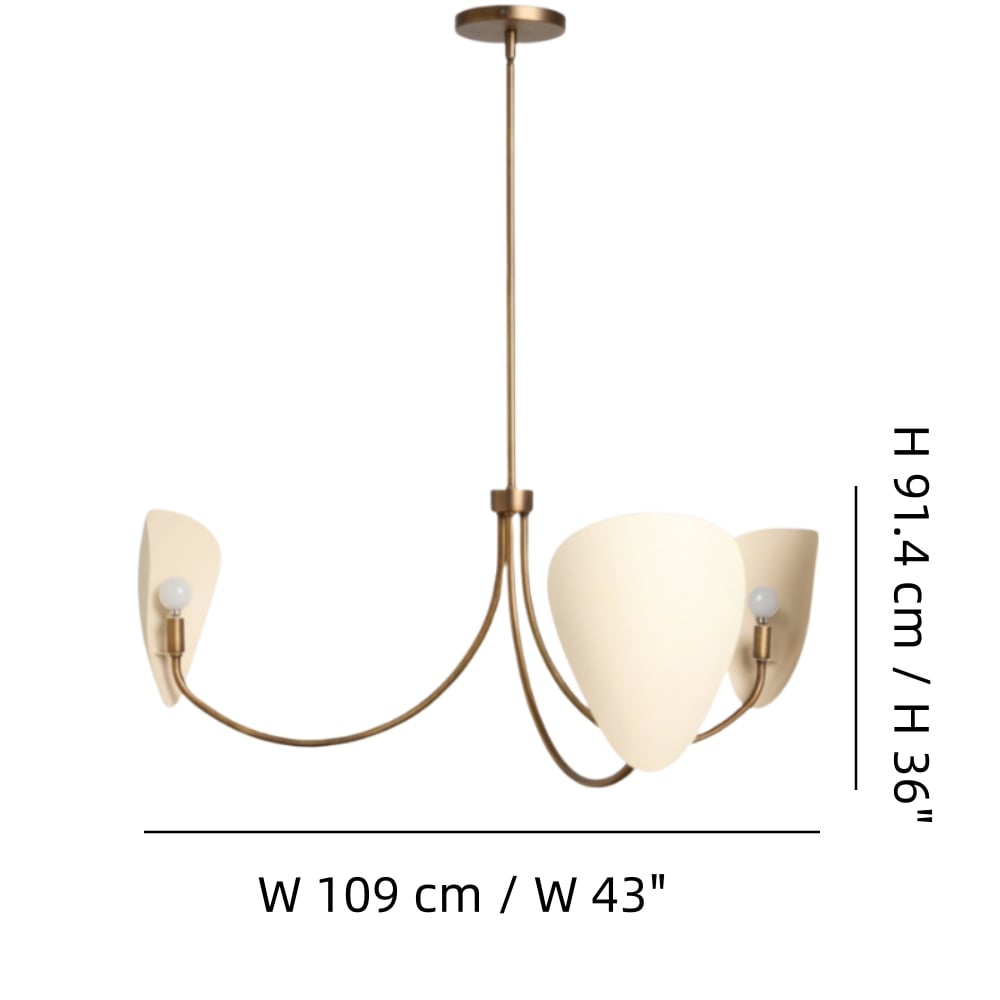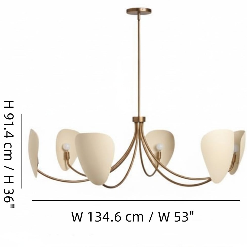 Mit Eleganz und Kunstfertigkeit gefertigt, besticht der Shella Kronleuchter durch anmutig geschwungene Metallarme und blütenblattähnliche Schirme in Beige, eingebettet in einen Rahmen aus antikem Messing. Seine skulpturale Silhouette verleiht ihm ein modernes und zugleich zeitloses Flair, ideal als auffällige Deckenleuchte in Esszimmern, Eingangsbereichen oder Wohnräumen. Erhältlich in zwei Größen, passend für Ihren Raum.