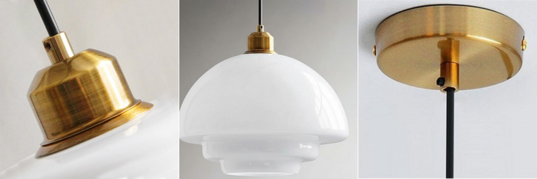 - Afwerkingen: Melkwit met messing accessoires, zwarte kabel.