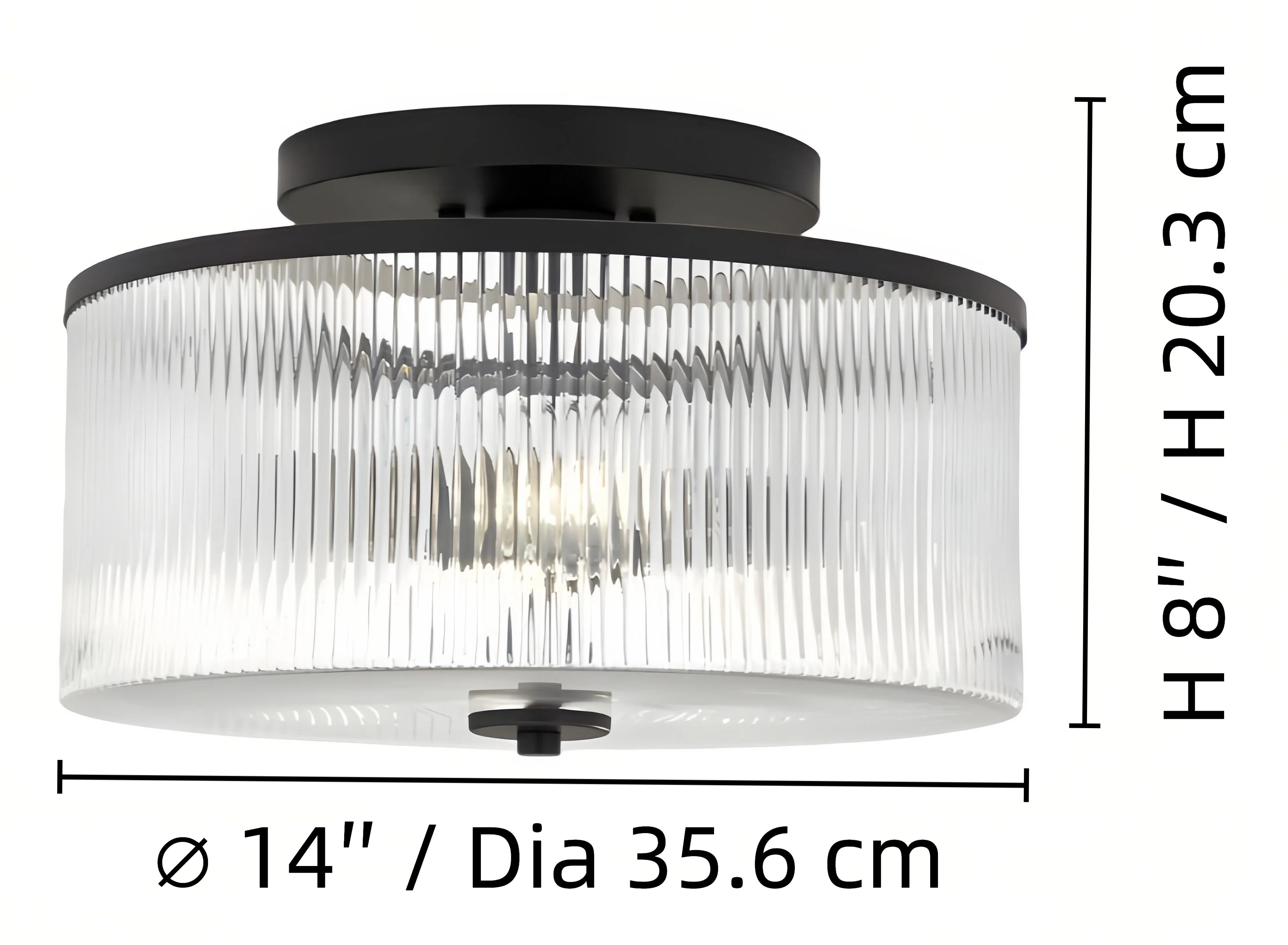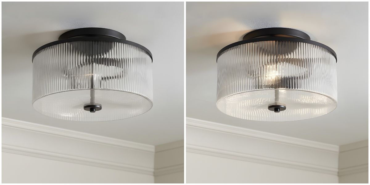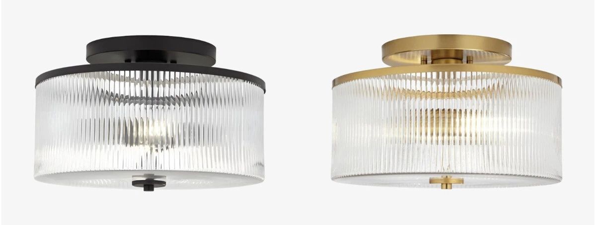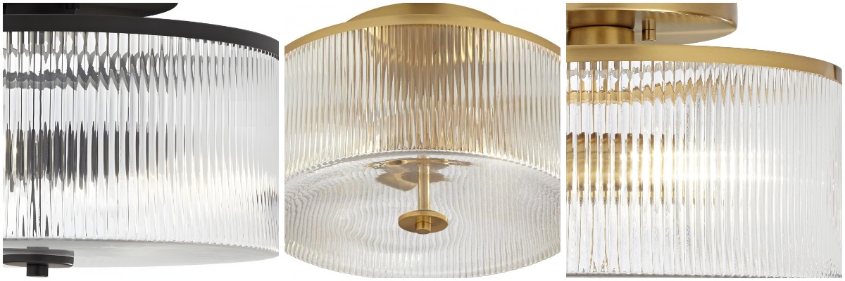 Deze semi-opbouw trommelplafondlamp toont helder geribbeld glas omhuld door een stevig metalen frame voor een getextureerd, lichtgevend effect. Een veelzijdig ontwerp met boerderij- en retroaccenten dat zowel moderne als klassieke interieurs verrijkt.