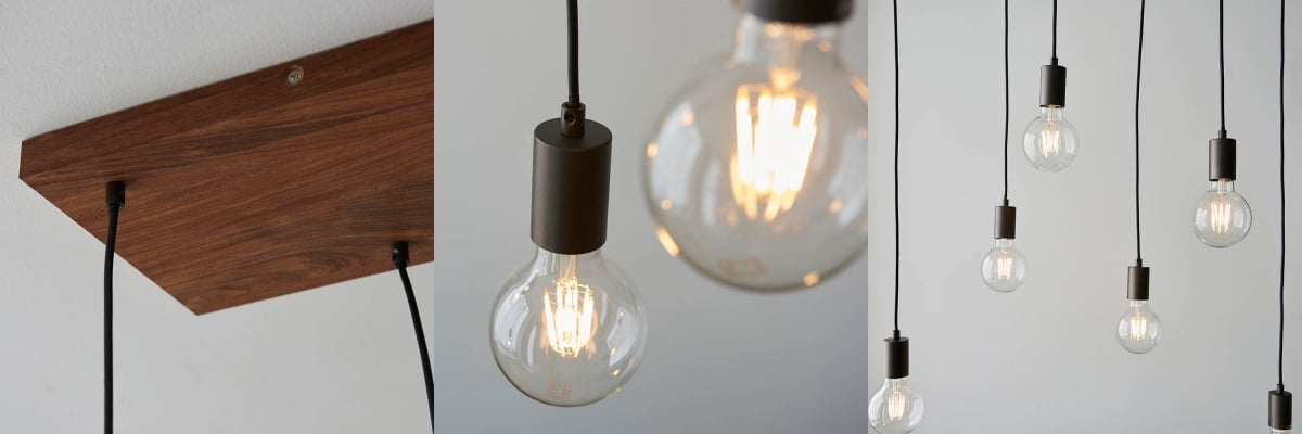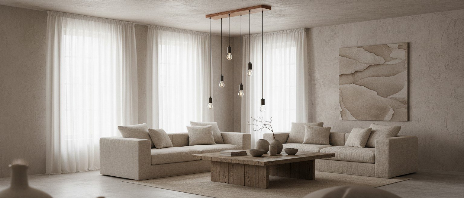 - Kenmerkend profiel: slanke balksilhouet en lineaire indeling vormen een strak middelpunt boven eilanden en tafels.