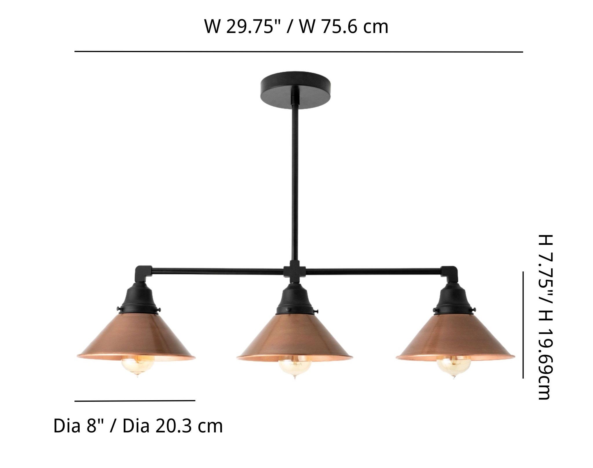 Elevate your kitchen with this stunning industrial chandelier. Featuring three hand-aged copper shades with unique patina, it creates perfect task lighting over islands. Its versatile design also complements dining rooms, billiards areas, and workspaces.