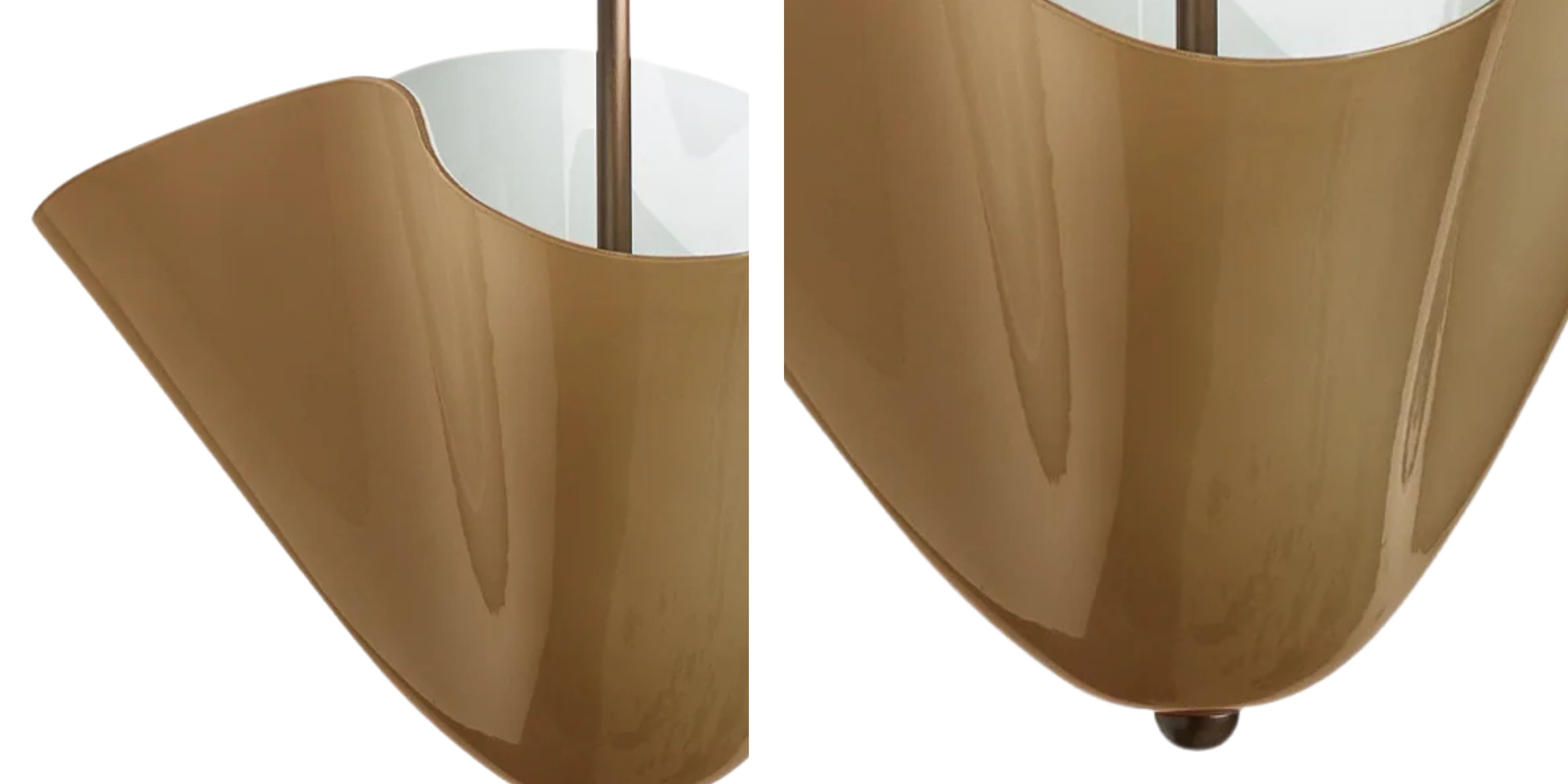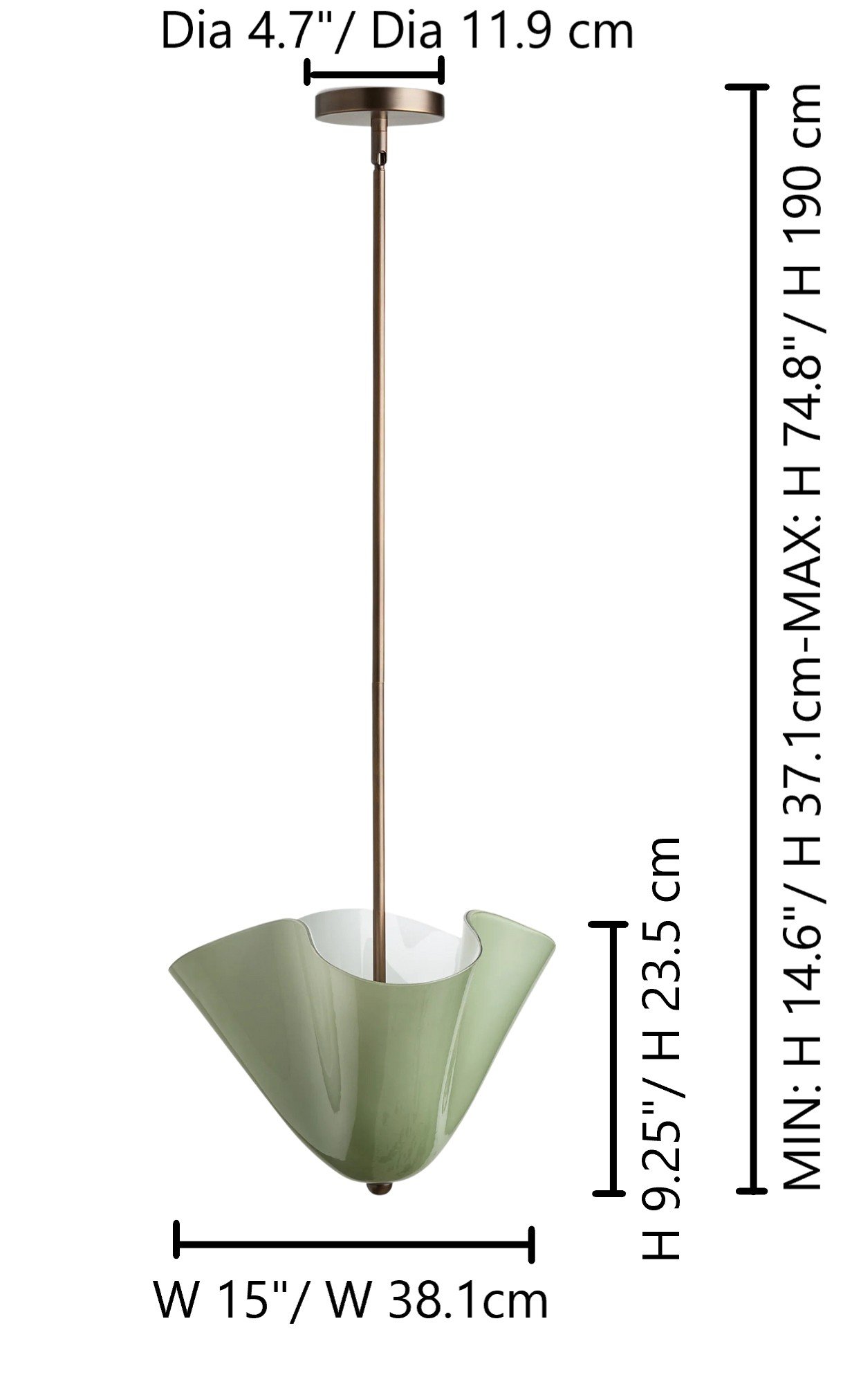 The Radner Pendant Light features a fluid silhouette with softly folded contours. Its colored glass shade is accented with brass detailing, casting a warm and sophisticated glow. Perfect for dining rooms, kitchens, or entryways seeking a refined modern touch.