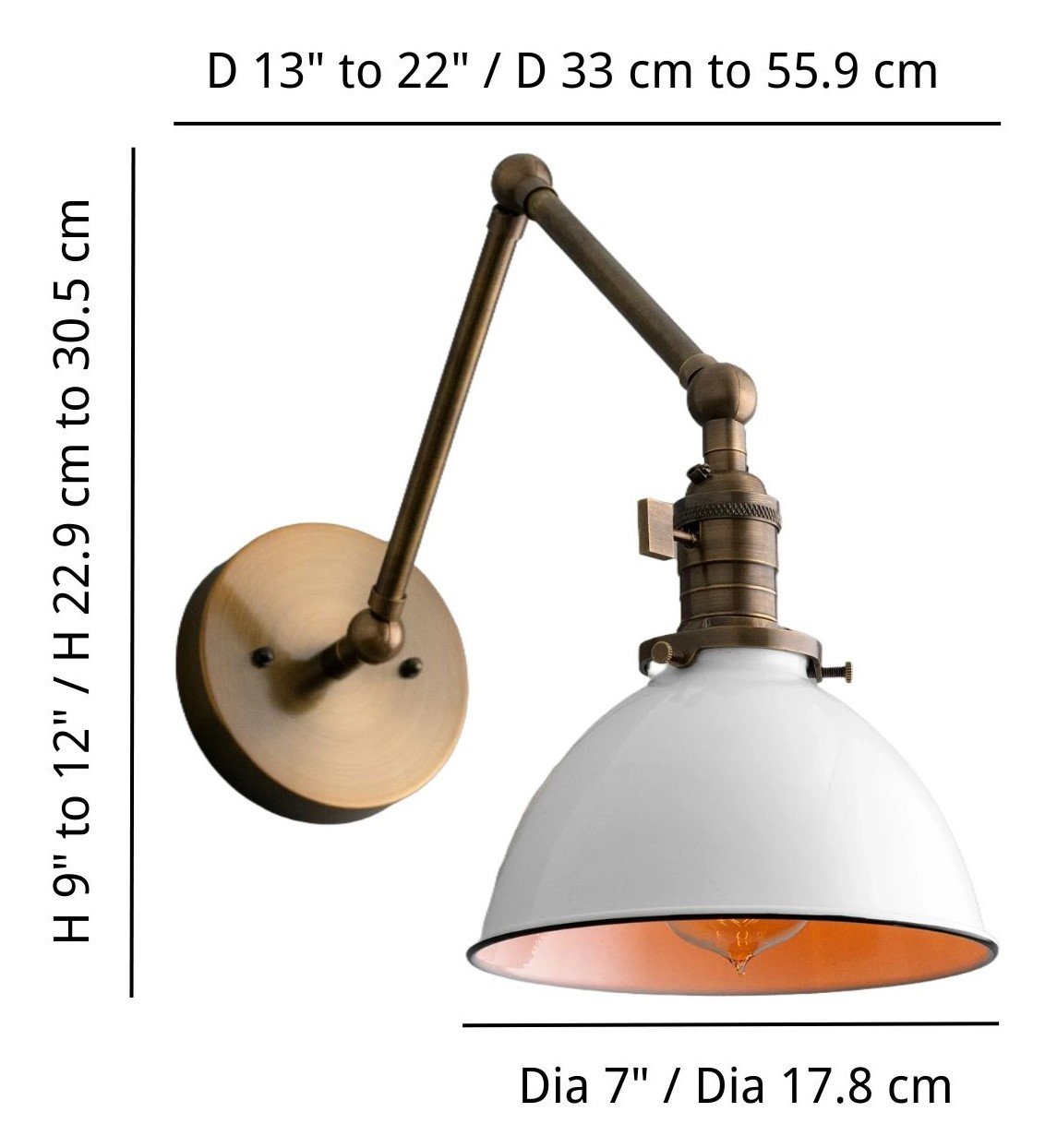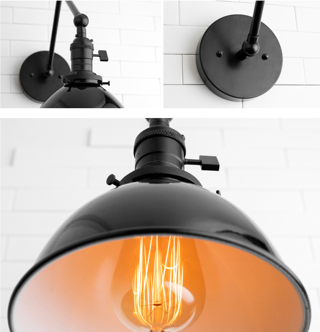 This vintage industrial wall lamp features an adjustable brass swing arm and a distinctive dome shade, emitting a warm, cozy glow. The classic metal base and flexible arm with ball joints allow easy positioning, perfect for focused tasks like reading. Its retro-industrial design adds a touch of elegance and functionality to any study, cafe, or workspace, enhancing the ambiance with a timeless aesthetic.
