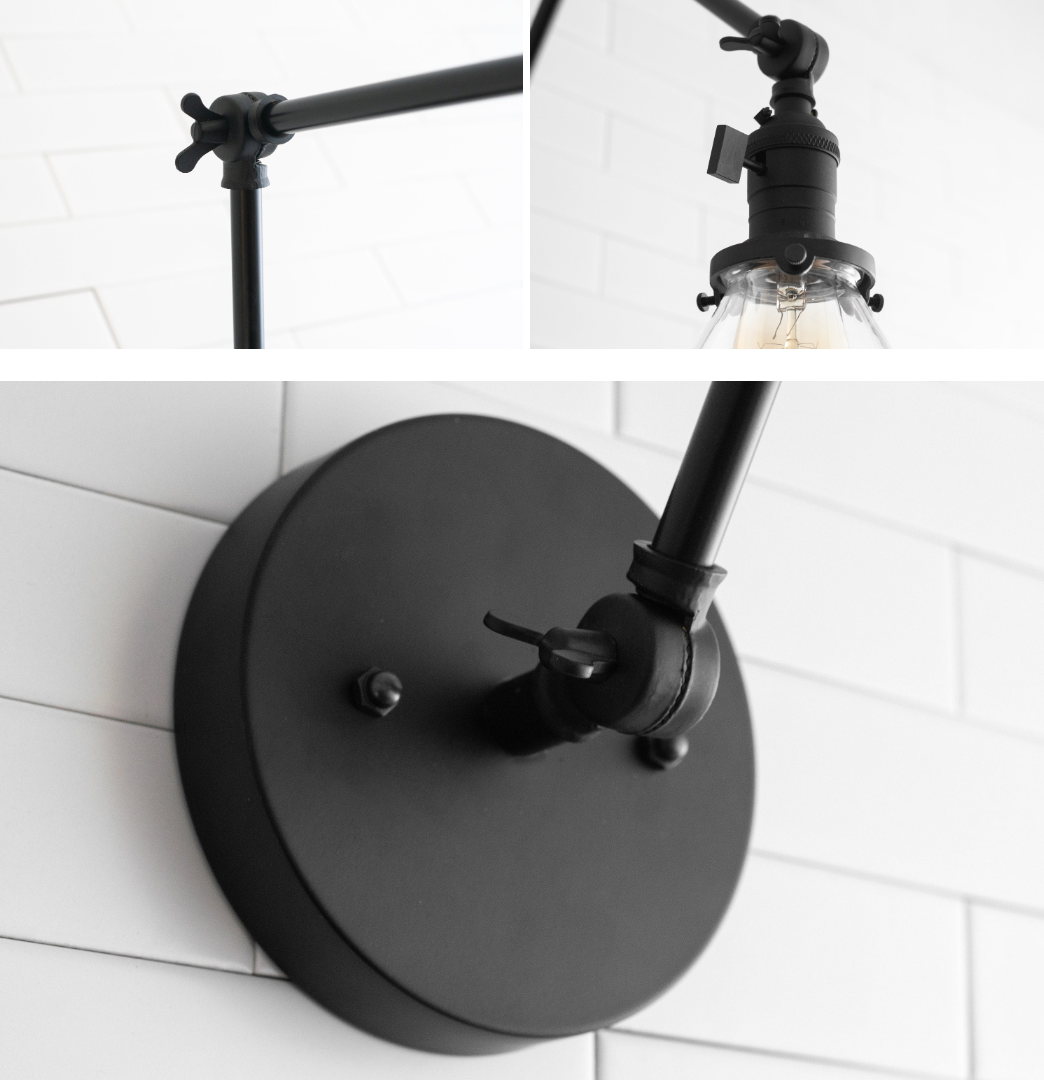 - The sconce is vertically adjustable and includes a key on/off switch on the lamp socket.