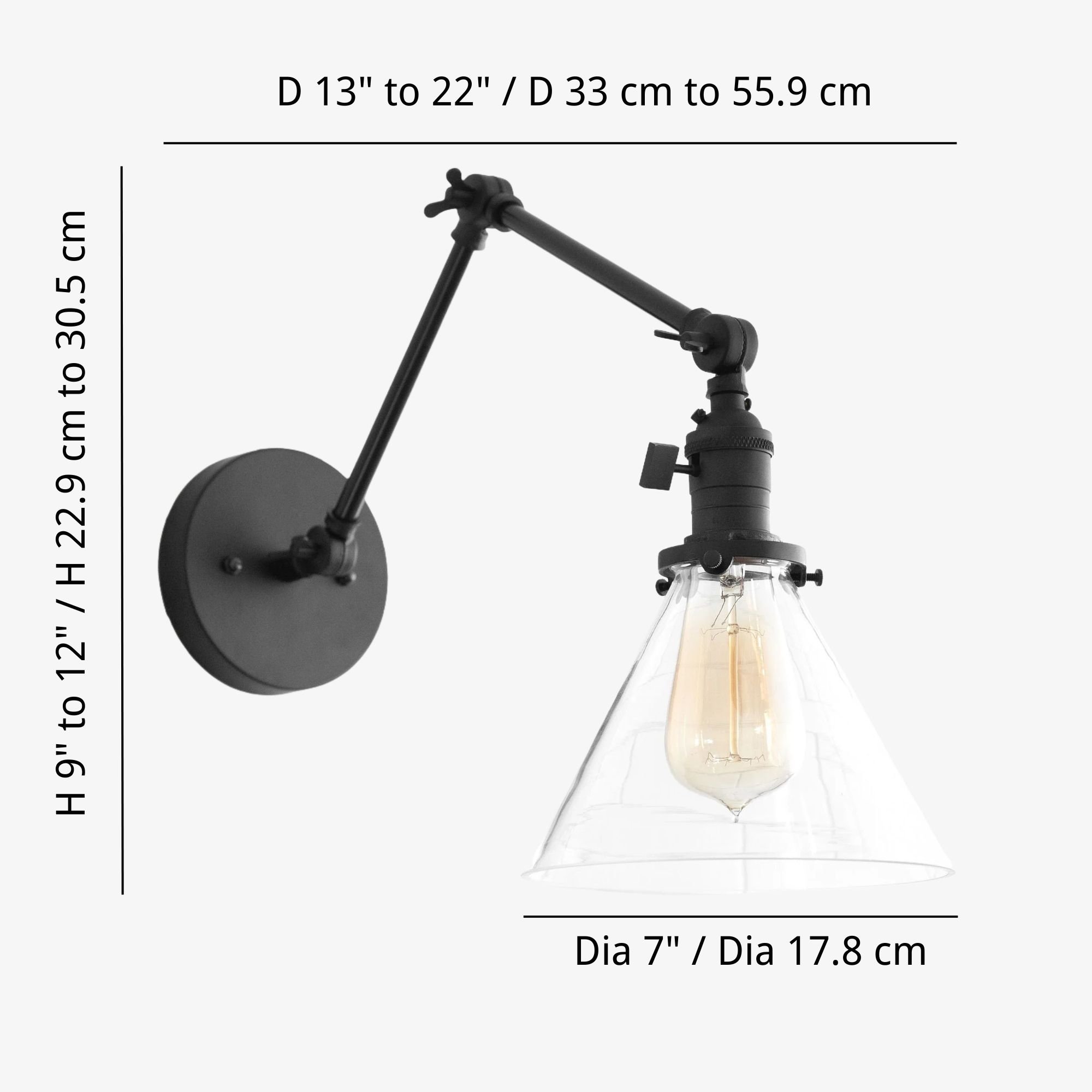 This industrial wall light features a fully adjustable metal arm with rotating joints for precise lighting direction. The transparent glass cone shade offers clean visibility while complementing the vintage-inspired design. Perfect for reading nooks, studios, and cafes seeking mechanical charm.